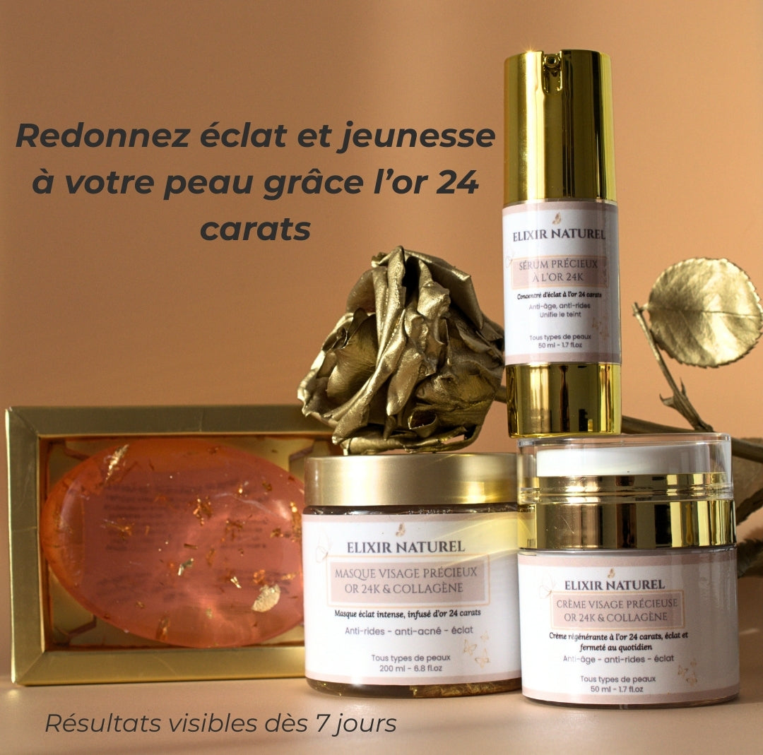 Formulés avec de l’or 24 carats et 80 % d’ingrédients d’origine naturelle, les soins visage Elixir Naturel agissent sur l’éclat, les imperfections et la qualité globale de la peau, pour des résultats visibles et durables.