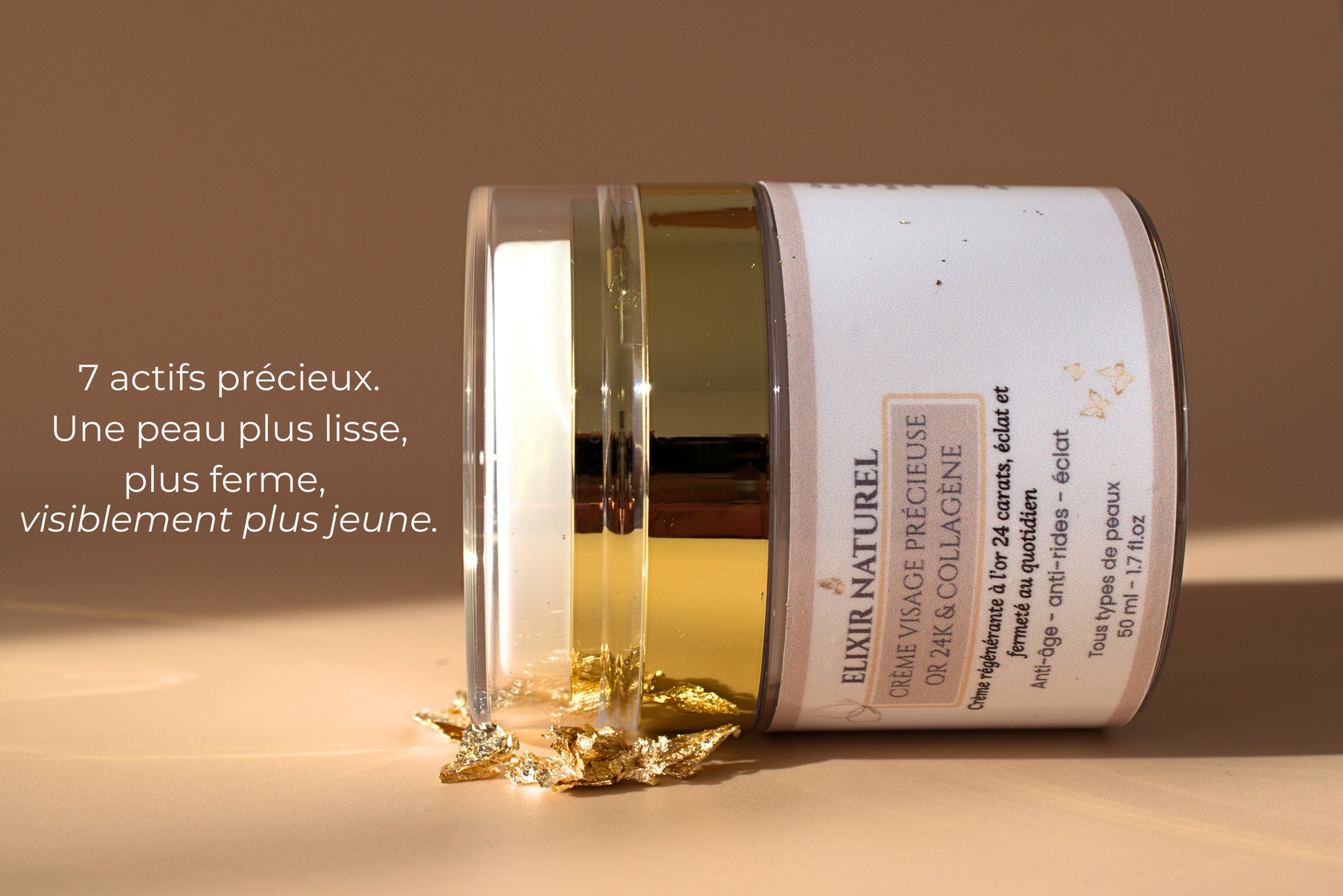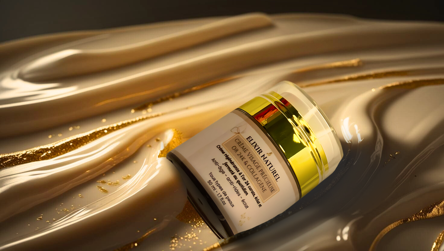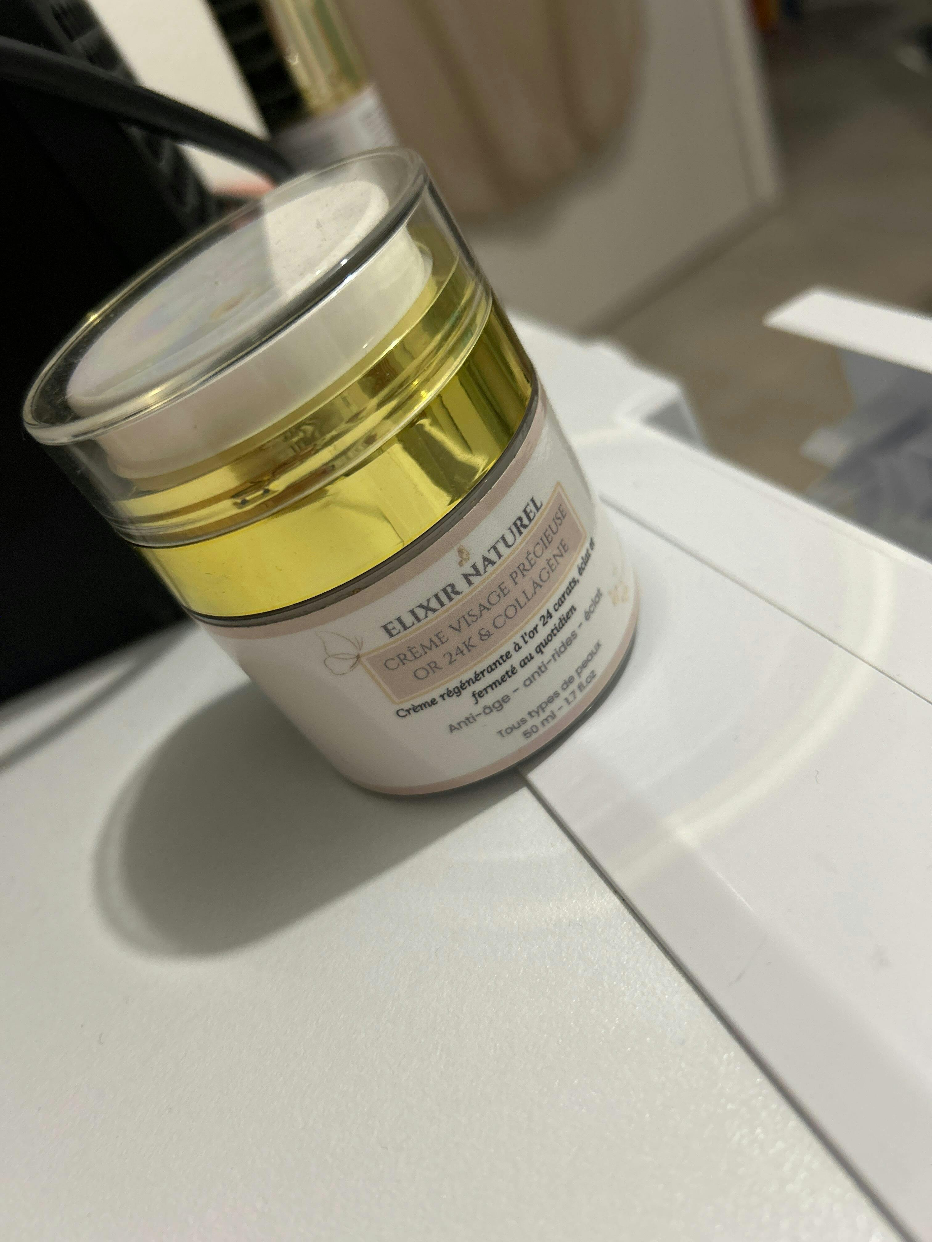Offrez à votre peau un soin royal, avec la Crème Précieuse Elixir Naturel, enrichie en or 24 carats, collagène, acide hyaluronique et rétinol.